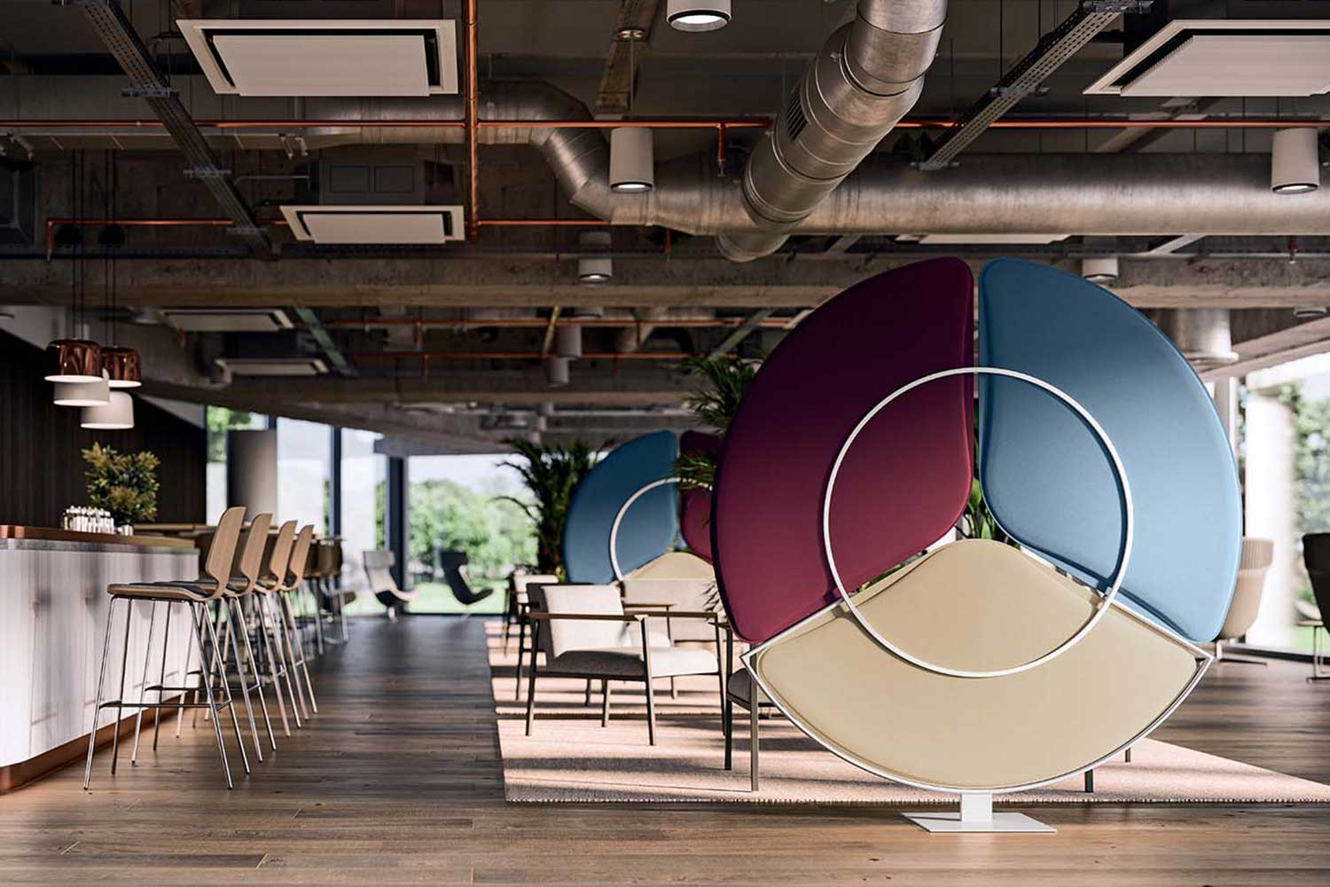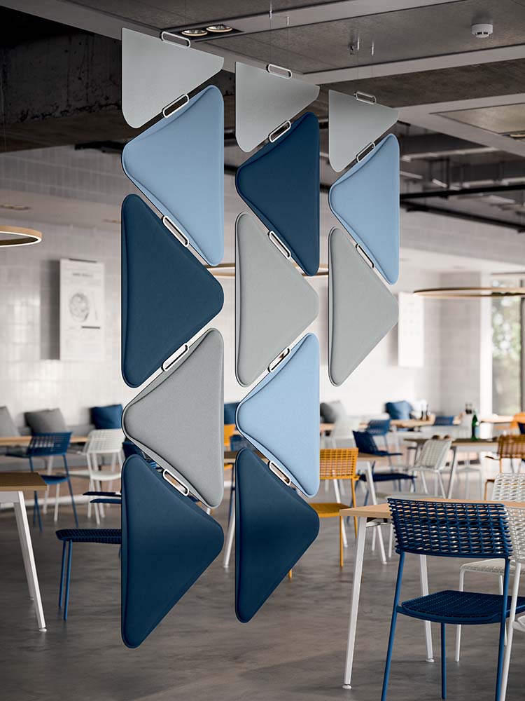 Pendant Cloak tiene una estructura en cascada, inestable sin intervenciones invasivas de suspensión desde el techo: una estructura ligera y reversible con un elevado rendimiento en términos de absorción del sonido. Los paneles se pueden personalizar con diferentes tonalidades, para adecuarlos al estilo del ambiente de destino.